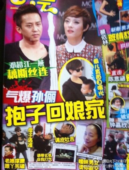 此前,周刊登載過一篇題為《直擊鄧超江一燕放縱寂寞夜》的文章,稱兩人在“幽靜別墅碰頭”深夜熱聊。日前,周刊又以重要版面刊發(fā)了一則題為《鄧超江一燕藕斷絲連 氣爆孫儷抱子回娘家》的文章,并配發(fā)了一組孫儷在母親的陪同下攜子現(xiàn)身機(jī)場(chǎng)的照片,引來不少網(wǎng)友的圍觀。照片中,孫儷一身黑衣素顏現(xiàn)身,黑超遮臉面無(wú)表情,還不時(shí)對(duì)著兒子等等說著什么。周刊也對(duì)這組照片進(jìn)行了一番圖說“老娘撐腰跟丫死磕”、“母子逃難”……